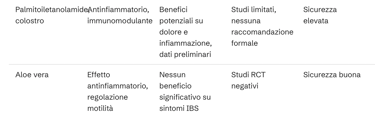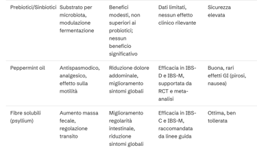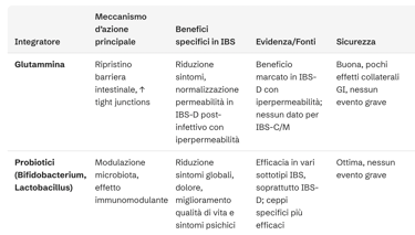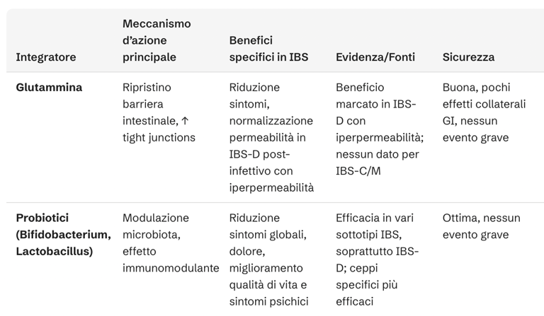 Rispetto alla glutammina, che mostra benefici specifici e robusti in pazienti con IBS-D post-infettivo e iperpermeabilità intestinale, altri integratori come probiotici (soprattutto ceppi di Bifidobacterium e Lactobacillus) hanno dimostrato benefici clinici significativi su sintomi globali, dolore e qualità di vita in vari sottotipi di IBS, con un profilo di sicurezza ottimale. Peppermint oil è supportato da evidenza di efficacia per la riduzione del dolore addominale e dei sintomi globali, in particolare in IBS-D e IBS-M. Fibre solubili come lo psyllium sono raccomandate per la regolarità intestinale, soprattutto in IBS-C e IBS-M. Curcumina e biopeptidi da pesce mostrano effetti promettenti su permeabilità e infiammazione, ma i dati clinici sono ancora limitati. Prebiotici/sinbiotici non hanno dimostrato benefici superiori ai probiotici. Vitamina D3, palmitoiletanolamide, colostro e aloe vera, presentano segnali di potenziale utilità nel contesto dell’IBS, ma le evidenze cliniche richiedono ulteriori studi controllati per definirne il reale ruolo terapeutico.